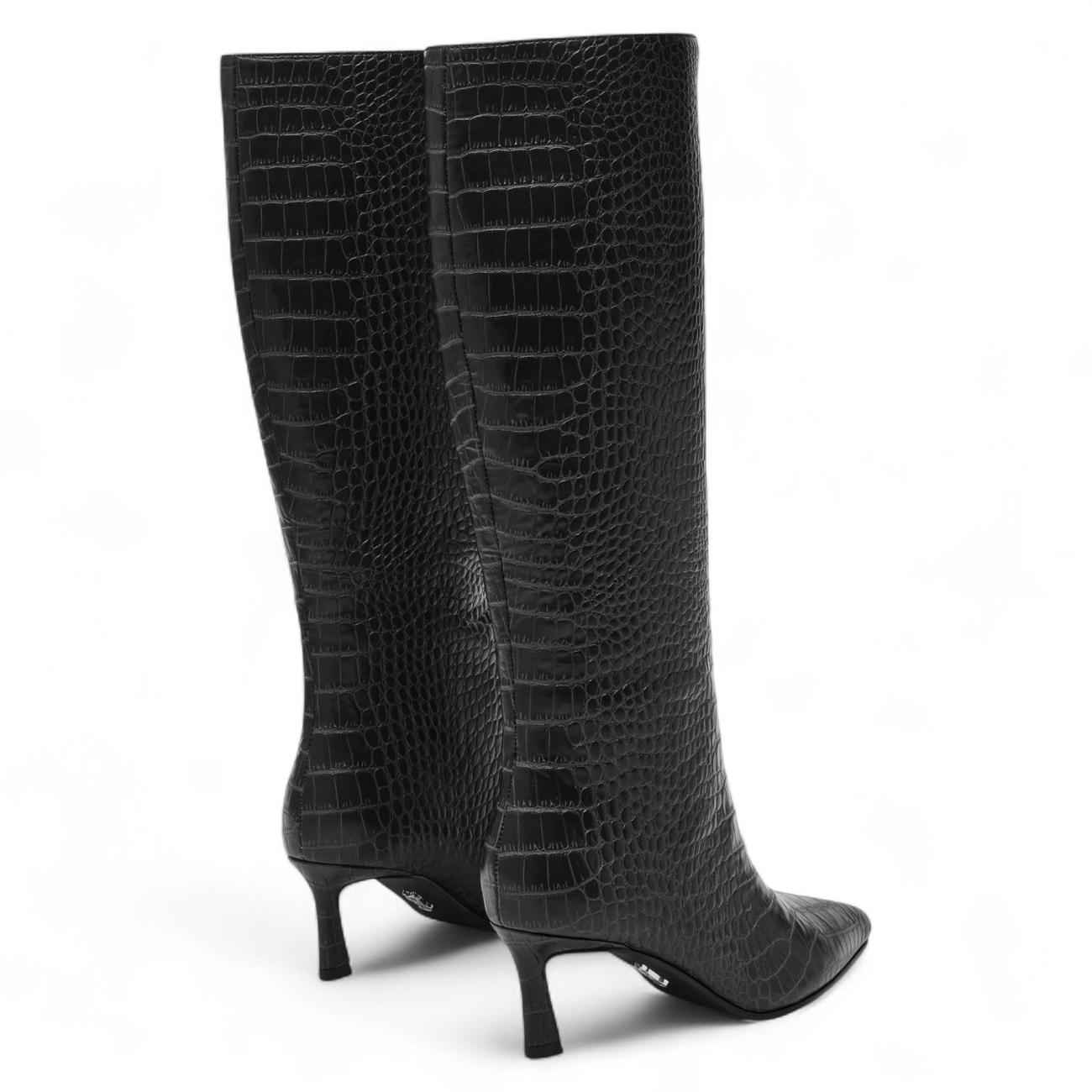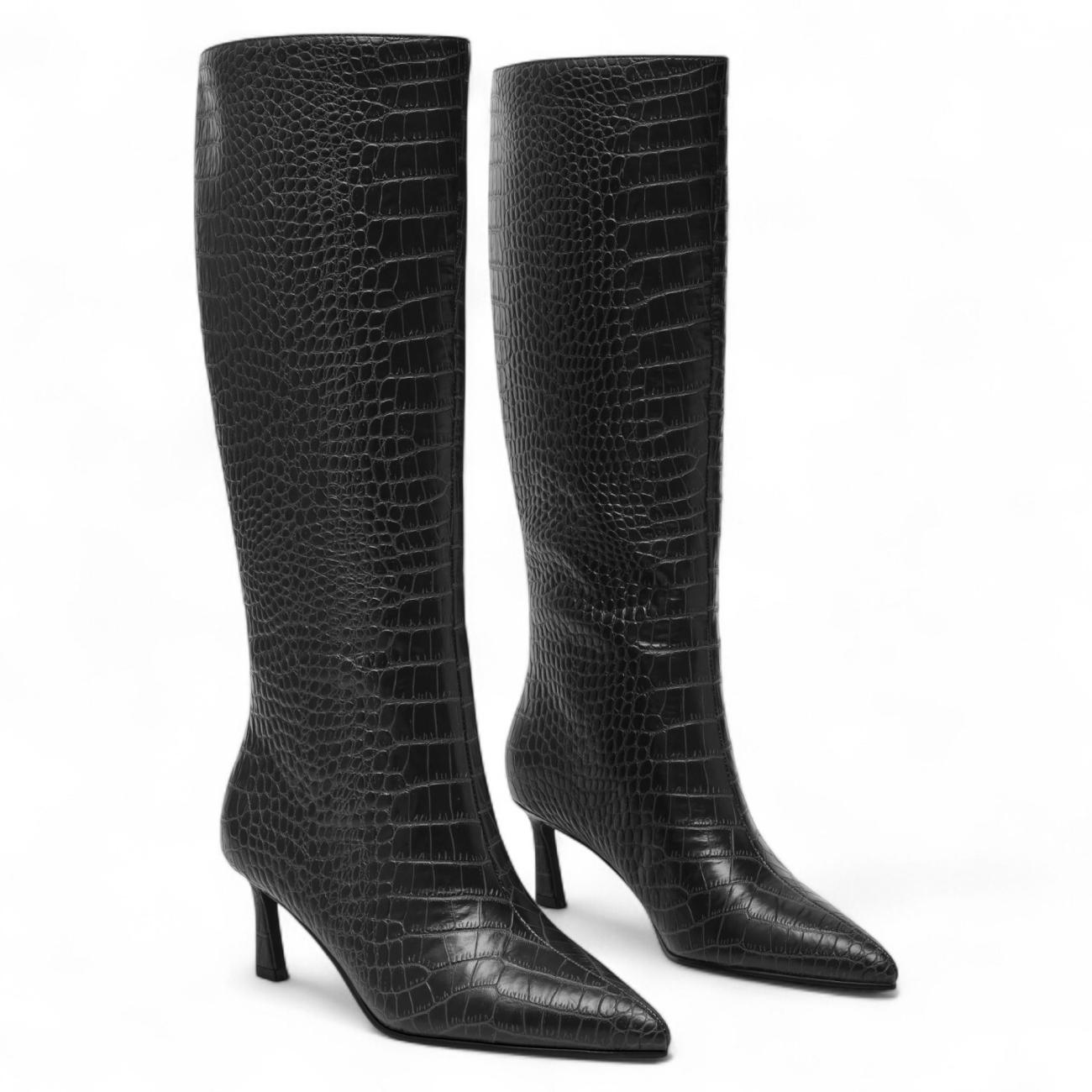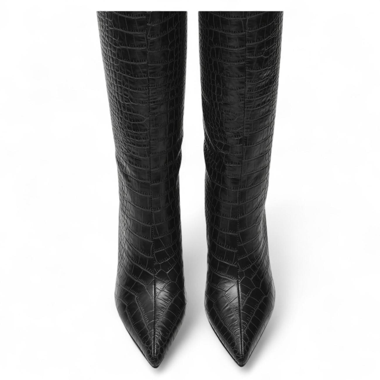 Stivali da donna in pelle nera con motivo coccodrillo, punta affusolata, gambale largo, tacco a spillo alto 6 cm, suola in gomma antiscivolo.