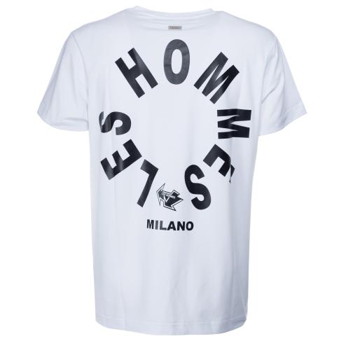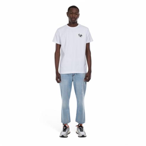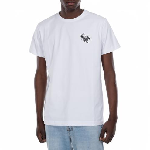 T-shirt in cotone di colore bianco modello regular con stampa nero sia davanti che sul retro, targetta in metallo logata cucita sul retro.