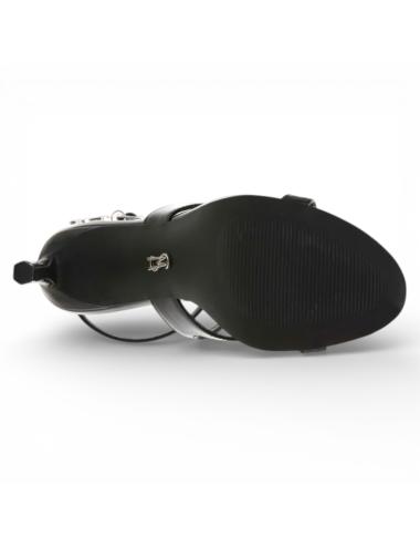 La tomaia in vernice nera crea un finish lucido premium. I listini sottili incrociati valorizzano il piede, mentre il cinturino alla caviglia con charm logo aggiunge un dettaglio distintivo di brand. La struttura aperta assicura leggerezza visiva e vestibilità femminile.