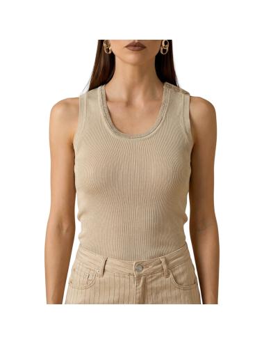 Top smanicato aderente in lurex di colore beige pensato per valorizzare la silhouette con semplicità, ideale per la stagione estiva e per look casual curati.