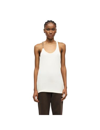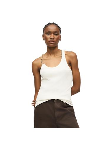Canotta da donna a costine di colore beige con catena oro, vestibilità regolare.