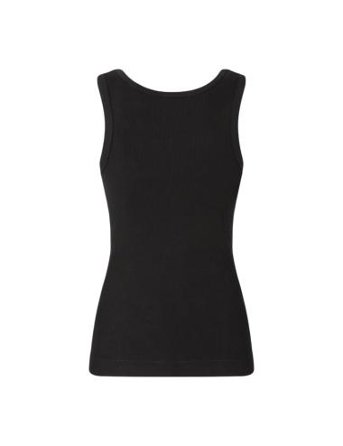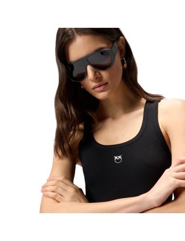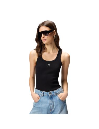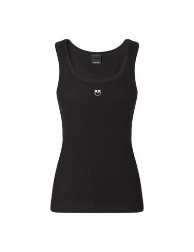 Canotta da donna a costine di colore nero con applicazione logo pinko in alto rilievo gommato colore argento, vestibilità regolare.