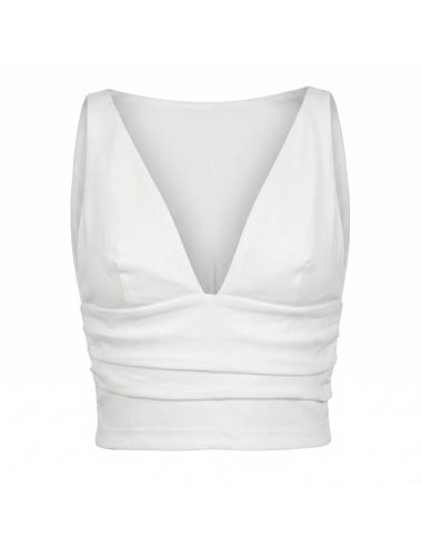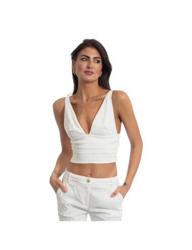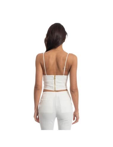 Crop top con spalline in tela di lino e viscosa colore bianco, scollo squadrato sul retro, fodera interna in cotone, chiusura con zipin metallo oro a vista sul retro.