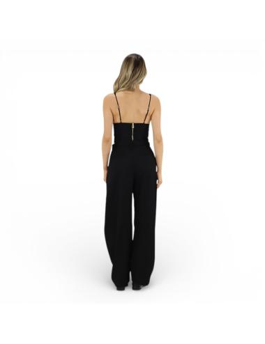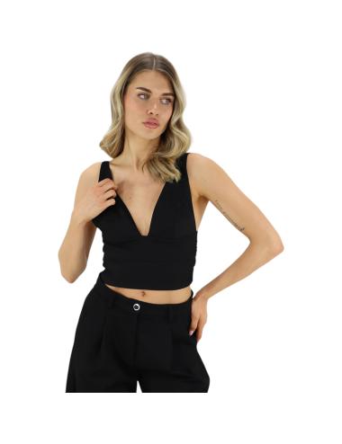 Crop top con spalline in tela di lino e viscosa colore nero, scollo squadrato sul retro, fodera interna in cotone, chiusura con zipin metallo oro a vista sul retro.