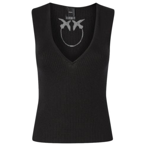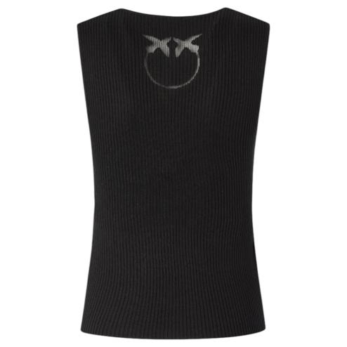 Il top senza maniche di Pinko, dalla linea aderente, è realizzato in maglia lavorata a costine di misto seta e cotone, garantendo una sensazione di lusso e comfort. Il dettaglio distintivo è l'intarsio del logo Love Birds nel centro del retro, lasciato in trasparenza, conferendo un tocco di eleganza e femminilità al capo. Perfetto per creare look sofisticati e chic, questo top aggiunge un tocco di glamour a qualsiasi outfit.