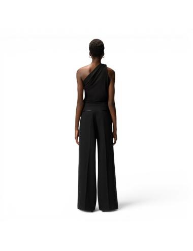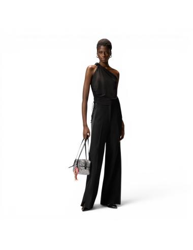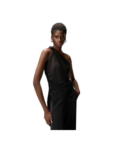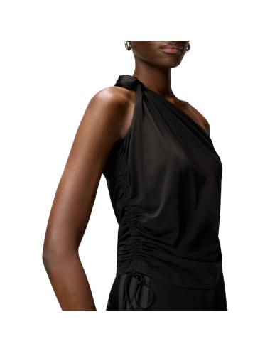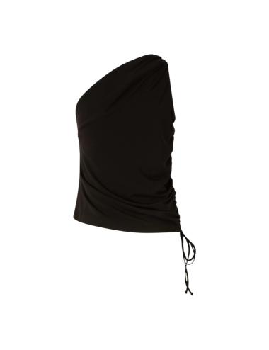 Top monospalla dal design contemporaneo, realizzato in jersey satinato fluido che accarezza la silhouette con un effetto leggero e raffinato, caratterizzato da un elegante nodo sulla spalla che crea un drappeggio morbido e dinamico, mentre la struttura asimmetrica valorizza il décolleté e conferisce un’allure sofisticata, perfetto per outfit da sera o look urban chic, grazie alla sua versatilità e al colore nero intenso che esalta ogni abbinamento.