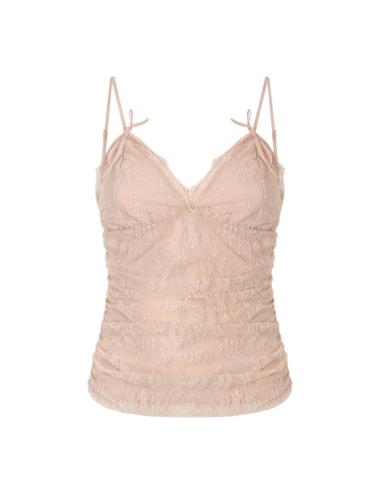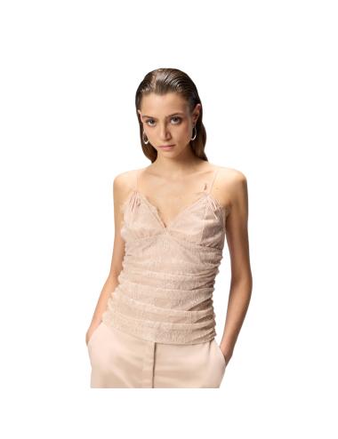 Top in pizzo dal design sofisticato e femminile, realizzato in pizzo leggero con motivo floreale che crea un raffinato effetto vedo non vedo, caratterizzato da sottili spalline e da uno scollo a V con profili delicati che valorizzano il décolleté, mentre la silhouette aderente segue le linee del corpo con eleganza, rendendolo perfetto per look serali, layering ricercati o abbinamenti dal gusto contemporaneo.
