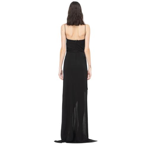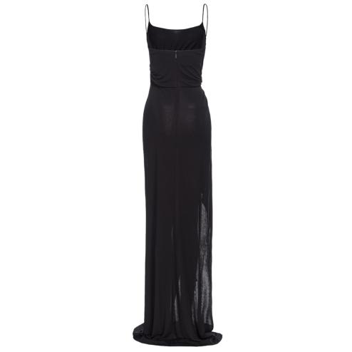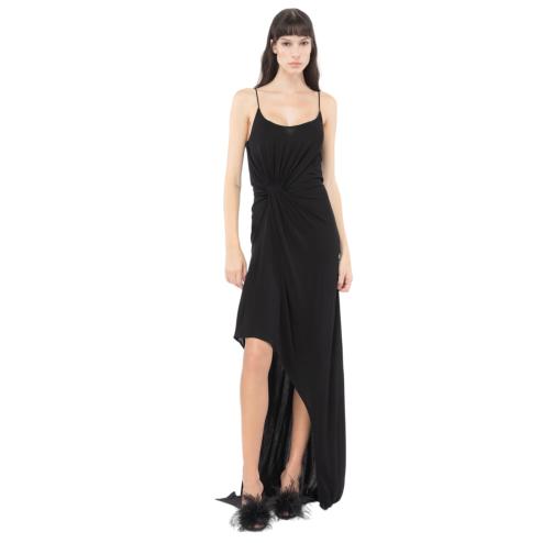 Pinko abito lungo nero senza maniche in tessuto interlock crêpe di viscosa incanta con la sua silhouette slipdress. Le spalline sottili e lo scollo dritto, sia davanti che sul retro, aggiungono un tocco di raffinatezza. Il dettaglio torchon laterale arricciato crea uno spacco sulla gonna lunga con leggero strascico, mentre la chiusura con zip invisibile nel centro dietro garantisce una vestibilità impeccabile. Un capolavoro di eleganza e stile senza tempo.